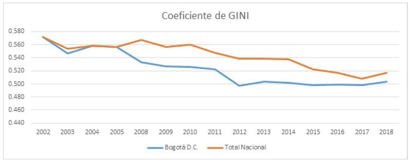 Fuente: Elaboración propia con cifras del DANE.La Figura 1 muestra el comportamiento del coeficiente de Gini a nivel nacional y el comportamiento de Bogotá en los últimos 16 años. Este es el indicador de desigualdad por excelencia dadas las facilidades que permite tanto en medición como en interpretación. El indicador oscila entre 0 y 1: entre más cercano a 0, existe mayor igualdad, y, entre más cercano a 1, existe un mayor grado de desigualdad.