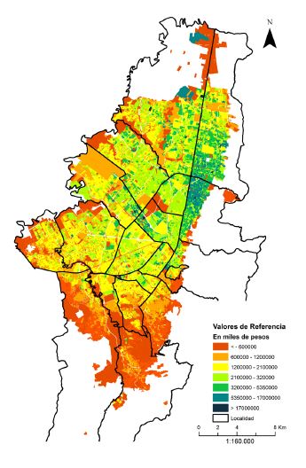 On a trouvé ainsi qu'il existe une relation significative entre la valeur du mètre carré de terrain et la distance par rapport aux strates socio-économiques considérées faibles (pour Bogotá catégorie socio-économique 1 et 2), montrant que les agents économiques paient des prix de plus en plus élevés, pour des lieux qui sont loin des basses catégories socio-économiques.