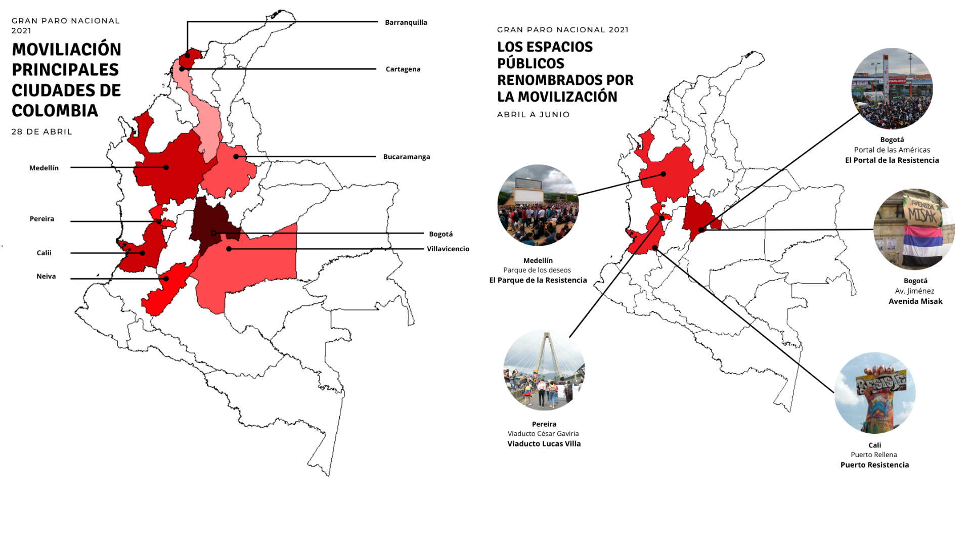 La espacialidad de la protesta social estuvo dispersa en varias ciudades del país (ver Figura 1). El 28 de abril la movilización social se realizó en los principales centros urbanos de Colombia. En Bogotá, Cali y Pereira se tuvo una mayor intensidad de la movilización que se fue prolongando en los siguientes días. La acción colectiva se manifestó con repertorios variados (ollas comunitarias, teatro y lúdica, actividades frente a las instituciones de gobierno, convites a los barrios populares, etc.) y no solamente en las marchas. También hubo una llamativa resignificación de lugares públicos. Por ejemplo, esta geografía de la resistencia llevó a que en Bogotá, Medellín, Cali y Pereira los espacios públicos fueran renombrados y los símbolos del progreso material o infraestructural readecuados. Los casos más icónicos, aunque no los únicos, fueron el Portal Resistencia y la Avenida Misak (Bogotá), el Puerto Resistencia, la Loma Dignidad y Uni Resistencia (Cali), el Parque de la Resistencia (Medellín) y el Viaducto Lucas Villa (Pereira). En otras ciudades los monumentos históricos se tumbaron o intervinieron: en Bogotá se tumbó la estatua de Gonzalo Jiménez de Quesada y ocurrió lo mismo en Cali, con la de Sebastián de Belalcázar; con la de Gilberto Alzate Avendaño, en Manizales; con la de Misael Pastrana Borrero, en Neiva, y con la del Bolívar Desnudo en Pereira.