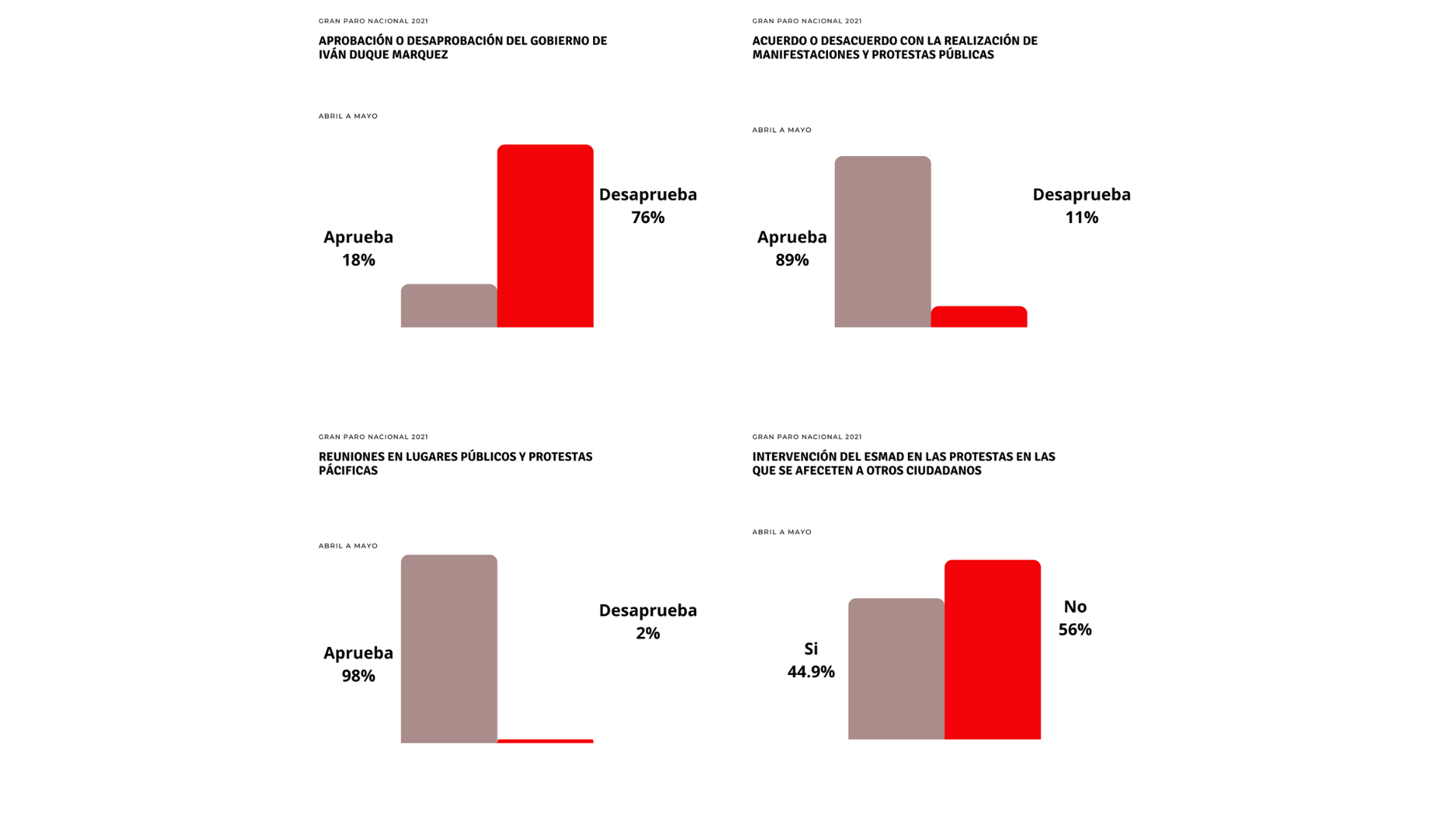 La represión policial que se utilizó como respuesta gubernamental fue denunciada por las organizaciones defensoras de derechos humanos y quedó registrada en el informe de la Comisión Interamericana de Derechos Humanos, en la que se establecieron recomendaciones para el Estado colombiano. Entre otras cosas, se recomendó que los funcionarios se abstengan de pronunciarse; que se garanticen los principios de proporcionalidad y defensa de la vida por parte de las fuerzas de policía que intervienen en las manifestaciones; que se definan protocolos para el uso de armas no letales y que se disminuya el uso de la figura de asistencia militar y traslado por protección (CIDH, 2021).