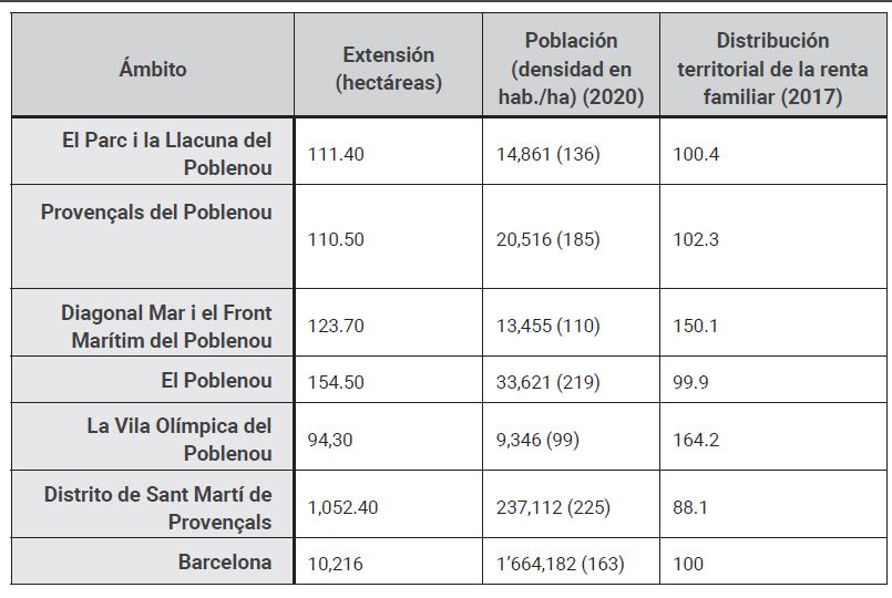 En la actualidad, el Poblenou pertenece al distrito de Sant Martí, situado en la parte noreste de Barcelona, y está reconocido como un pilar fundamental de la industrialización catalana y española. El Poblenou (palabra catalana que significa pueblo nuevo) era parte del municipio autónomo de Sant Martí de Provencals hasta 1897, cuando, junto con otros núcleos urbanos alrededor de la ciudad, como Gracia, Les Corts, Sants, Sant Andreu y Sant Gervasi, se anexionó a Barcelona. Actualmente, el distrito de Sant Martí está formado por diez barrios, siendo el cuarto distrito de la ciudad en extensión y el segundo en población. El Poblenou está configurado por cinco barrios que se extienden en 594.4 ha de superficie, donde viven 91,799 habitantes (ver Tabla 1). El área de estudio fue objeto de relevantes proyectos de regeneración urbana a partir de la década de 1980: 180 hectáreas de La Vila Olímpica del Poblenou fueron transformados para albergar las Olimpiadas de 1992 (Bohigas et al., 1986); 180 hectáreas de suelo de la Diagonal Mar i el Front Maritim del Poblenou fueron objeto de las intervenciones relacionadas con el Forum de las Culturas de 2004 (Delgado, 2004) y alrededor de 200 hectáreas de suelo de El Parc i la Llacuna del Poblenou, El Poblenou, y Provencals del Poblenou han sido afectados por las previsiones del nuevo distrito de actividades terciarias del 22@ de 2000 (Ayuntamiento de Barcelona, 2000).