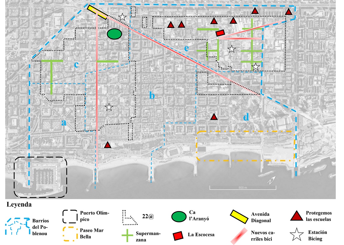 Las actuaciones del plan Superilla Barcelona en los barrios del Poblenou: (a) La Vila Olímpica del Poblenou, (b) El Poblenou, (c) El Parc i la Llacuna del Poblenou, (d) Diagonal Mar i el Front Marítim del Poblenou, (e) Provençals del Poblenou