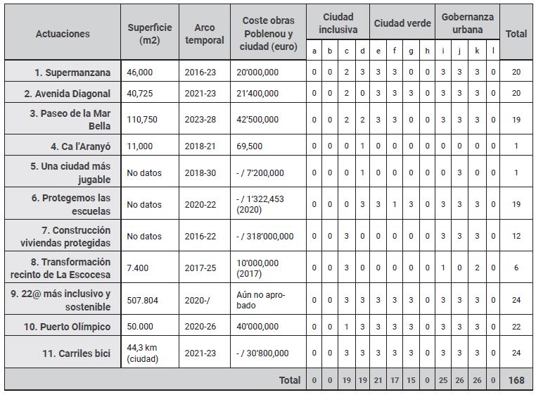 En la Tabla 2 se expone la puntuación de las acciones de regeneración urbana en el Poblenou, con valores que oscilan entre 0 y 3.