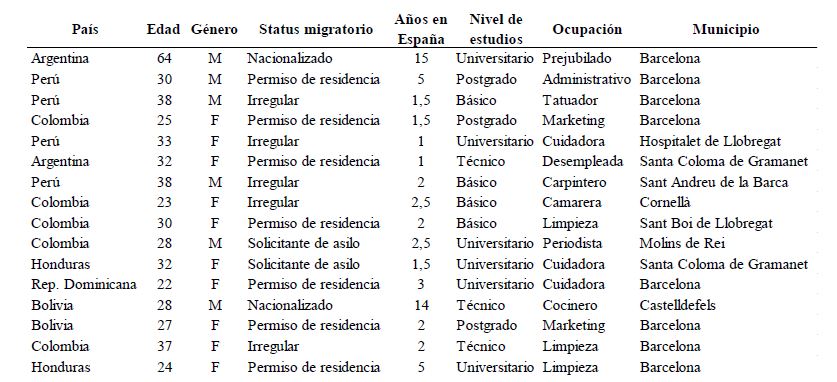 Para analizar la problemática expuesta, se han efectuado 16 entrevistas en profundidad a inmigrantes latinoamericanos residentes en habitaciones subarrendadas en el AMB durante el periodo de confinamiento, siguiendo un guion semiestructurado y abordando temas como el proyecto migratorio, la inserción y trayectoria residencial en España, las características físicas de la vivienda actual y la convivencia durante el período de cuarentena. La muestra está conformada por ocho personas residentes en la ciudad de Barcelona y ocho en otros municipios del AMB. En total son 10 mujeres y seis hombres (ver Tabla 1): 15 de ellos residen en subarriendo y uno es subarrendador. Los participantes se han seleccionado de acuerdo con un casillero tipológico definido según sexo y nivel de estudios, y buscando el ‘punto de saturación teórico’ de las categorías, garantizando heterogeneidad en las características relevantes. Dicho punto se alcanza cuando la información recogida responde a los objetivos de la investigación y nuevas entrevistas no aportan nada a lo ya conocido. Los participantes se contactaron a través de fundaciones y colectivos de inmigrantes y a través de grupos en redes sociales, intentando identificar voces relevantes. El trabajo de campo se realizó entre los meses de septiembre y noviembre de 2020, con 14 entrevistas efectuadas en parques y plazas del AMB y dos en modalidad virtual.
