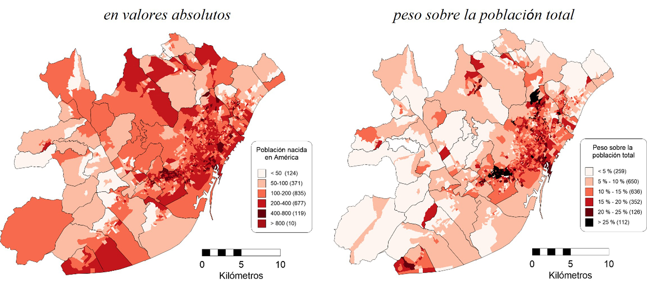 Fuente: Elaboración propia, datos del Padrón de Población, Instituto Nacional de Estadística (INE).En cuanto a sus pautas de distribución territorial (ver Figura 1), en la ciudad de Barcelona los latinoamericanos se caracterizan por una amplia dispersión, a excepción de los barrios de clases altas (en el noroeste), donde su presencia es menor, debido a mayores niveles de renta en estas zonas. En cambio, es en el noreste de la ciudad, donde se ubican los barrios obreros, donde su presencia ha aumentado durante los últimos años. Estos espacios, junto a los que se encuentran en L’Hospitalet de Llobregat, colindantes con la ciudad central, son los que acogen una proporción más elevada de inmigrantes de estos orígenes. Como ejemplo, y a escala de sección censal, encontramos que en 112 secciones censales su peso es superior al 25% de la población. Al mismo tiempo, es más difícil encontrarlos en las áreas periféricas del AMB; de esta forma, su representatividad es significativamente menor en los municipios de menor dimensión, más alejados del centro.