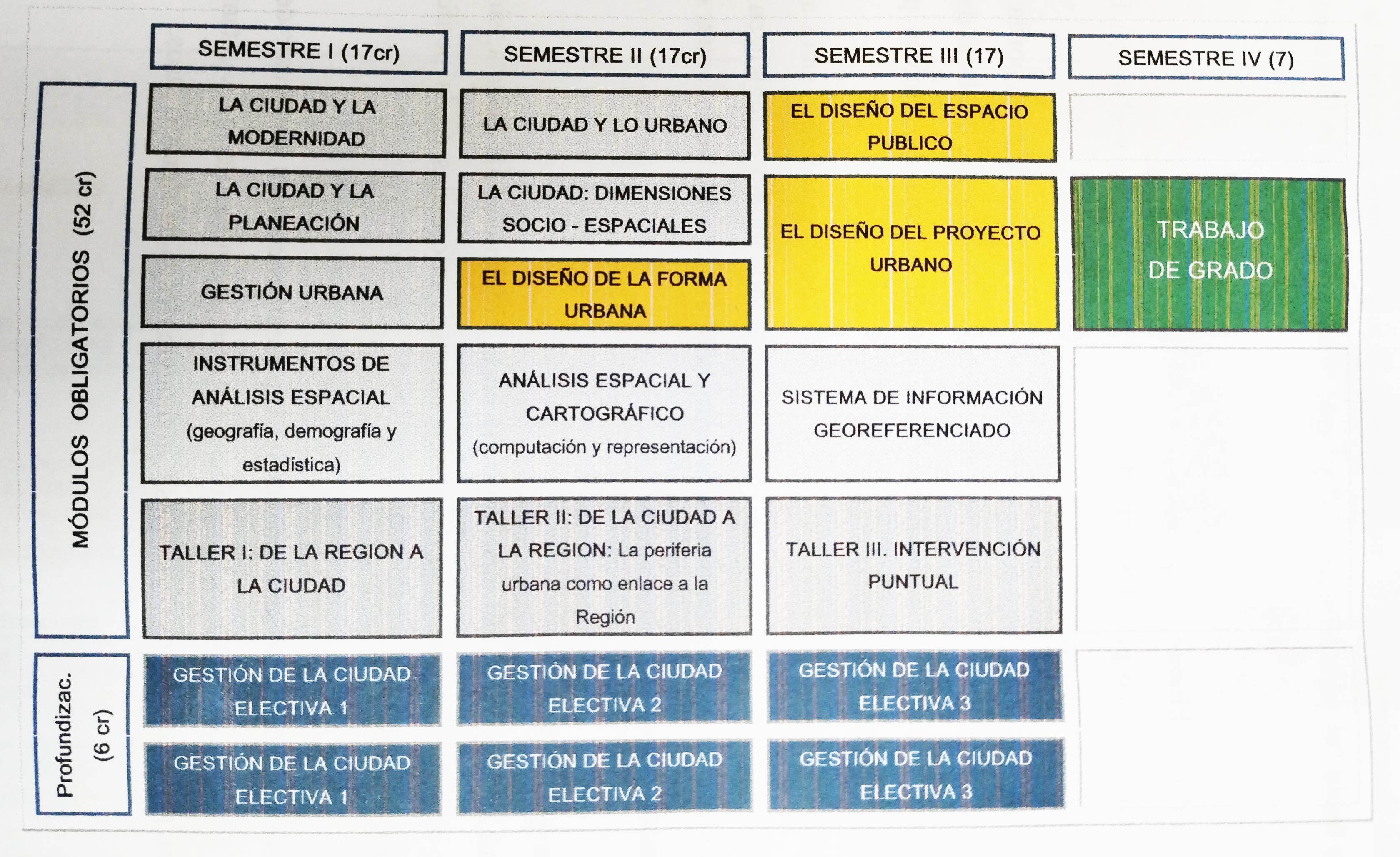 Archivo Facultad de Arquitectura y Diseño, Pontificia Universidad JaverianaEl plan de estudios de la MPUR-M.D.I. tenía ocho trimestres con una intensidad de 12 horas por semana, para un total de 1,000 horas de docencia y 46 créditos. Las clases eran dictadas los martes y jueves por la tarde y los sábados en la mañana. La M.D.I., al igual que el programa español con el que tenía convenio, tenía cinco áreas de enseñanza: planeación urbana y regional, desarrollo inmobiliario, derecho inmobiliario y de la construcción, ética inmobiliaria y metodología de la investigación, y se exigía un trabajo de tesis para culminar el programa.