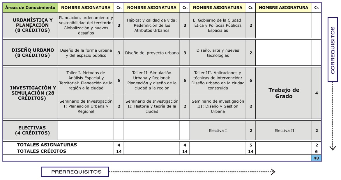 Paralelamente, Roberto Rodríguez Silva y Pedro Polo en 1991 con el marco de la Ley 9 de 1989, Ley de Reforma Urbana, intentaron crear un posgrado en Diseño Urbano en la Facultad de Arquitectura y Diseño de la PUJ que no tuvo mucha acogida. Como principal referente de esta propuesta estaba la recién creada Maestría en Urbanismo de la UNAL sede Bogotá, que data de 1990; la maestría tenía un plan de estudios de cuatro semestres que incluía clases teóricas sobre historia y teoría urbana, planificación y gestión, dos talleres de proyecto urbano y seminarios de instrumentos de investigación, para concluir con una tesis (Escuela de Planeación Urbano-Regional, 2007). Este plan de estudios en diseño urbano denotaba un enfoque del programa hacia el estudio ciudad desde su morfología, posiblemente influenciado por las teorías de la escuela italiana, ejemplificada por autores como Leonardo Benevolo (1992) y Aldo Rossi (1982).