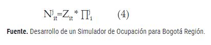 Como insumos para el repartidor están el índice de ocupación y el de construcción; de la aplicación de estos se obtendrá el potencial normativo en metros cuadrados construidos, los cuales se distribuirán de acuerdo con los parámetros definidos en el repartidor hasta el año 2035 en los suelos suburbanos disponibles. Los metros cuadrados nuevos para la unidad espacial i correspondientes al uso del suelo j en el tiempo t, Njit, donde ∏ji es un escalar que expresa la probabilidad del uso j para la unidad espacial i, la cual es constante en el tiempo. ver (ecuación 4)