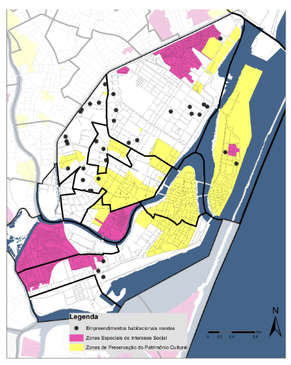 Cartografia contendo as Zonas Especiais de Interesse Social e as Zonas de Preservação do Patrimônio Cultural e a localização dos empreendimentos recentes de uso habitacional e misto na RPA1