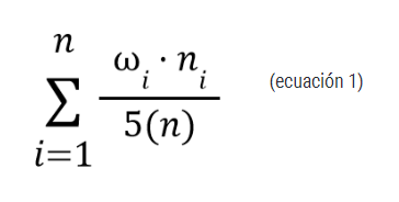 La suma de los pesos de cada dimensión permite obtener la unidad que compone al modelo GOTA. Y la ecuación para obtener el índice multidimensional es equivalente a la suma de los productos de cada dimensión por su puntaje en el indicador individual por dimensión, lo que es igual a la siguiente expresión: