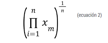 De la ecuación (1), para cada factor (o variable) se obtendrá un puntaje en términos de razón, el cual contribuirá al puntaje subgrupal por dimensión, y se calculará como la media geométrica de los puntajes de los factores fi en la dimensión Di. El uso de la media geométrica contribuye a generar un indicador individual que normaliza la variabilidad entre factores pertenecientes al grupo, y es el primer método de agregación para el cálculo del indicador individual por dimensión (Joint Research Centre-European Commission, 2008), el cual se obtiene de la siguiente manera: