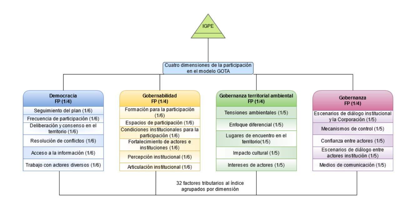 Los anteriores elementos permiten afirmar dos asuntos de interés, primero, no son amplios los abordajes sobre la medición de la participación y menos en temas ambientales; lo segundo, estos índices deben partir de las delimitaciones de factores ponderables, y, sobre todo, incluir en ellos, como los actores perciben o viven la participación y las condiciones para su realización. Este vacío temático, sumado a la necesidad de medir la calidad de la participación a partir de la implementación del GOTA, fundamentó la creación del presente Índice General de la Participación Efectiva (IGPE), el cual se centra en las percepciones, actitudes y aptitudes que tienen los actores en torno a lo ambiental en el contexto de su actividad en instrumentos de planeación diseñados por Corantioquia.