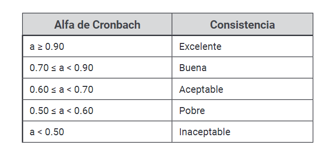 Para la validación de cada uno de los cuatro constructos (democracia, gobernabilidad, gobernanza territorial ambiental, gobernanza), se usó el estadístico alfa de Cronbach () por cada instrumento seleccionado. Este método, usado especialmente para estimar la confiabilidad de las escalas actitudinales y aptitudinales para medir un constructo (Tavakoll & Dennick, 2011), permite valorar si los elementos agrupados en una dimensión o constructo tienen la característica de ser consistentes internamente y homogéneos (Tavakoll & Dennick, 2011); es decir, estima el grado de interrelación existente entre los elementos que componen el constructo y determina si la variabilidad al interior del constructo es consistente o no (Cortina, 1993). Un puntaje de aceptación y validez del alfa () debe ser superior a 0.7 (Taber, 2018). A continuación, se presentan los rangos del alfa y su respectiva significación (tomado de Wikarsa & Angdresey, 2021):