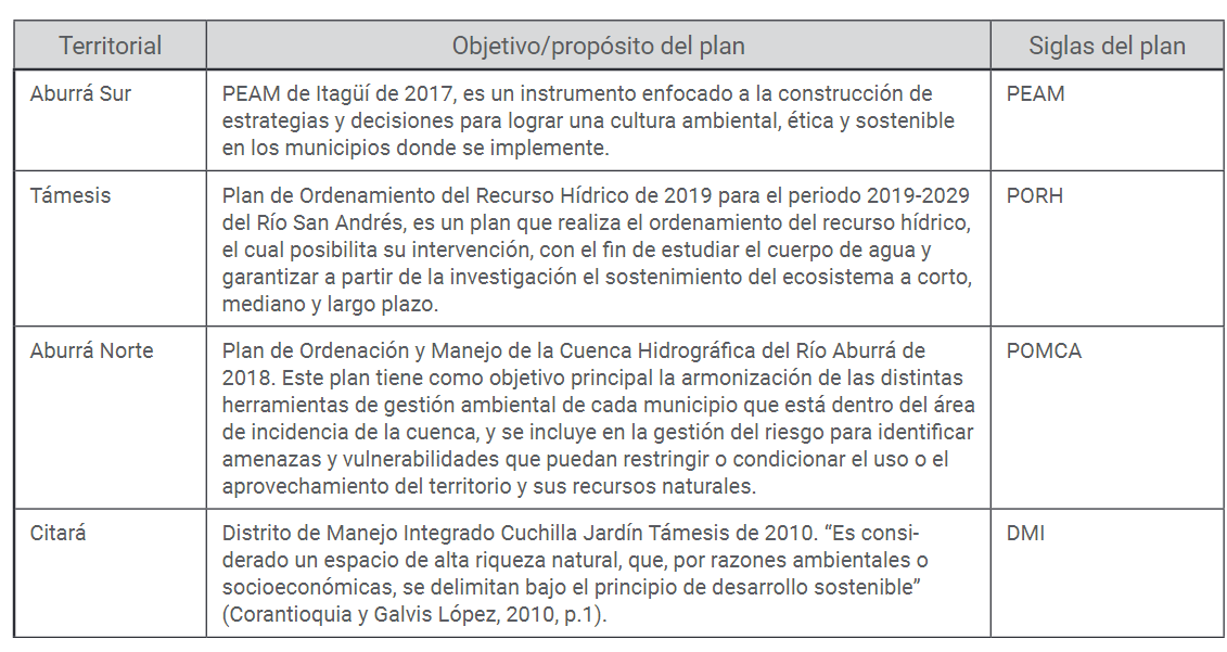 En este sentido, el presente artículo tiene como objetivo presentar la propuesta de índice para la medir la participación efectiva en instrumentos de planeación ambiental ejecutados en el departamento de Antioquia, dentro de la jurisdicción de Corantioquia, así como los resultados obtenidos en su aplicación en cuatro casos de estudio: Plan de Educación Ambiental Municipal PEAM-Itagüí (2017); Plan de Ordenamiento del Recurso Hídrico 2019-2029 del Río San Andrés; Plan de Ordenación y Manejo de la Cuenca Hidrográfica del Río Aburrá (2018), y Distrito de Manejo Integrado Cuchilla Jardín Támesis (2010). Los cuatro planes seleccionados son el resultado de aplicar un análisis multicriterio a 355 instrumentos de planeación inventariados en la jurisdicción de Corantioquia. En estos planes la Corporación interactúa como formuladora, participante, ejerce funciones de control y seguimiento o es orientadora. La priorización es el resultado de la aplicación de 13 variables, detalladas más adelante.