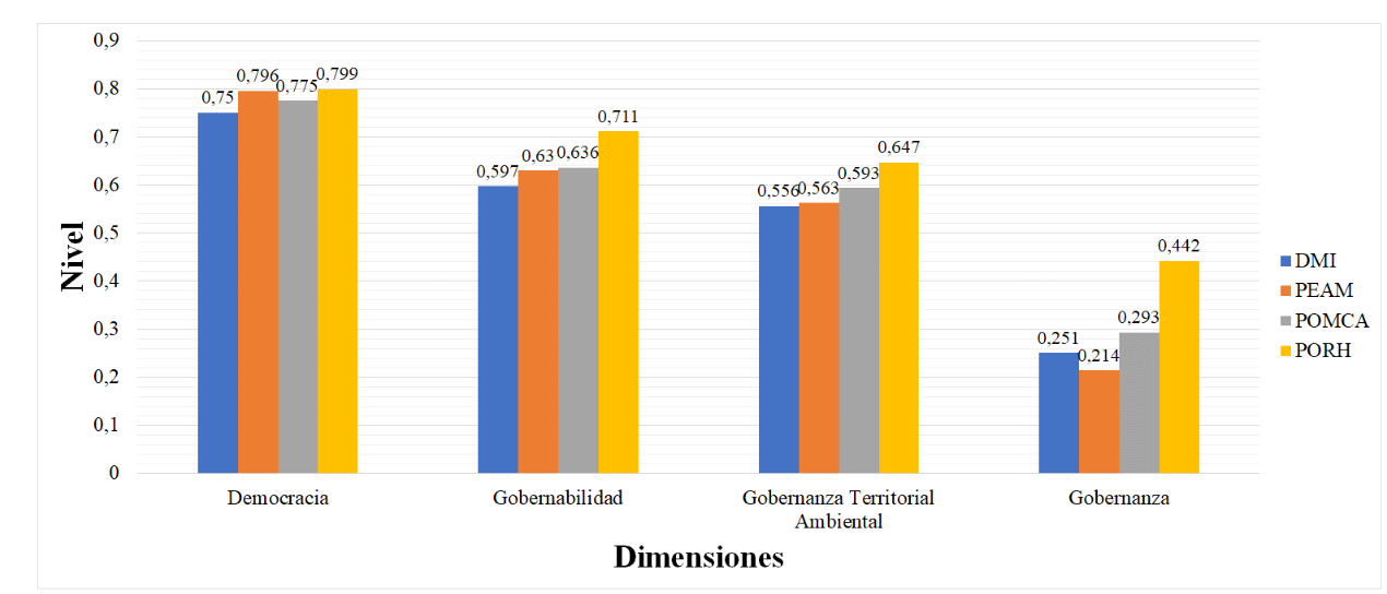 Fuente: Elaboración propia.La segunda dimensión con mayor puntaje a partir del cálculo el IGPE fue la gobernabilidad en los casos de estudio analizados: DMI (0.597); PEMA (0.630); POMCA (0.636) y PORH (0.711); es decir, las condiciones institucionales que determinan la participación. La tercera dimensión con un puntaje muy cercano a la anterior, fue la gobernanza territorial ambiental en los casos de estudio analizados: DMI (0.556); PEMA (0.563); POMCA (0.593) y PORH (0.647), la cual es asumida como un proceso de deliberación y negociación entre los actores que habitan un territorio en específico.
