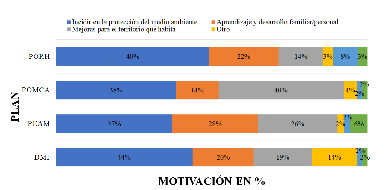 Fuente: Elaboración propia.Cuando se analizan aspectos relacionados con las principales motivaciones de la población que participó en los instrumentos de planeación ambiental, se encuentra que para el DIM destaca de manera predominante la protección del medio ambiente (43.8%), como también el aprendizaje y desarrollo personal/familiar (19.6%), y las mejoras para el territorio que habitan (18.8%). En una proporción mucho menor, los participantes expresaron como motivaciones acceder a empleo o mejorar ingresos (1,8%) y crear lazos con las personas de su comunidad (1.8%). Estas motivaciones dan cuenta de variables a nivel económico y comunitario que buscan fortalecer dichos aspectos a partir de la participación.