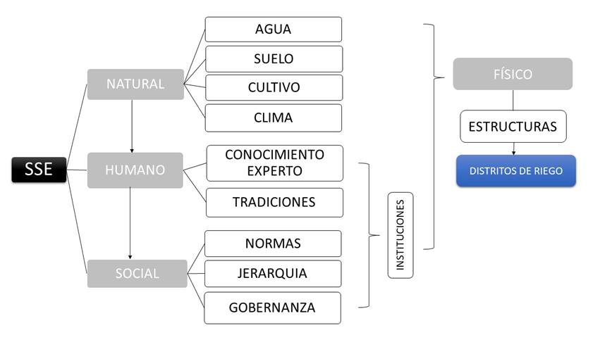 Fuente: Elaboración propia.Desde 1992, Elinor Ostrom ha puesto sobre la mesa las características especiales que tienen los DR, en especial frente al desarrollo regional, el uso de recursos y la gobernanza de los mismos, sobre todo frente al fortalecimiento de una institución que permita la protección del recurso hídrico. Muchos de los análisis bajo el enfoque de SSE en Distritos de Riego se han desarrollado con el fin de obtener respuestas a las dinámicas que se producen entre el capital social y natural, para entender y dar solución a problemas como el uso ineficiente del agua, particularmente en escenarios de cambio climático. Bajo la perspectiva aquí expuesta, al afirmar que los DR no son SSE no se pretende deslegitimar las investigaciones realizadas con anterioridad; al contrario de lo que se podría pensar, dichos resultados son una herramienta robusta y de alto valor para el mejoramiento de la capacidad de gobernanza y de desarrollo territorial.