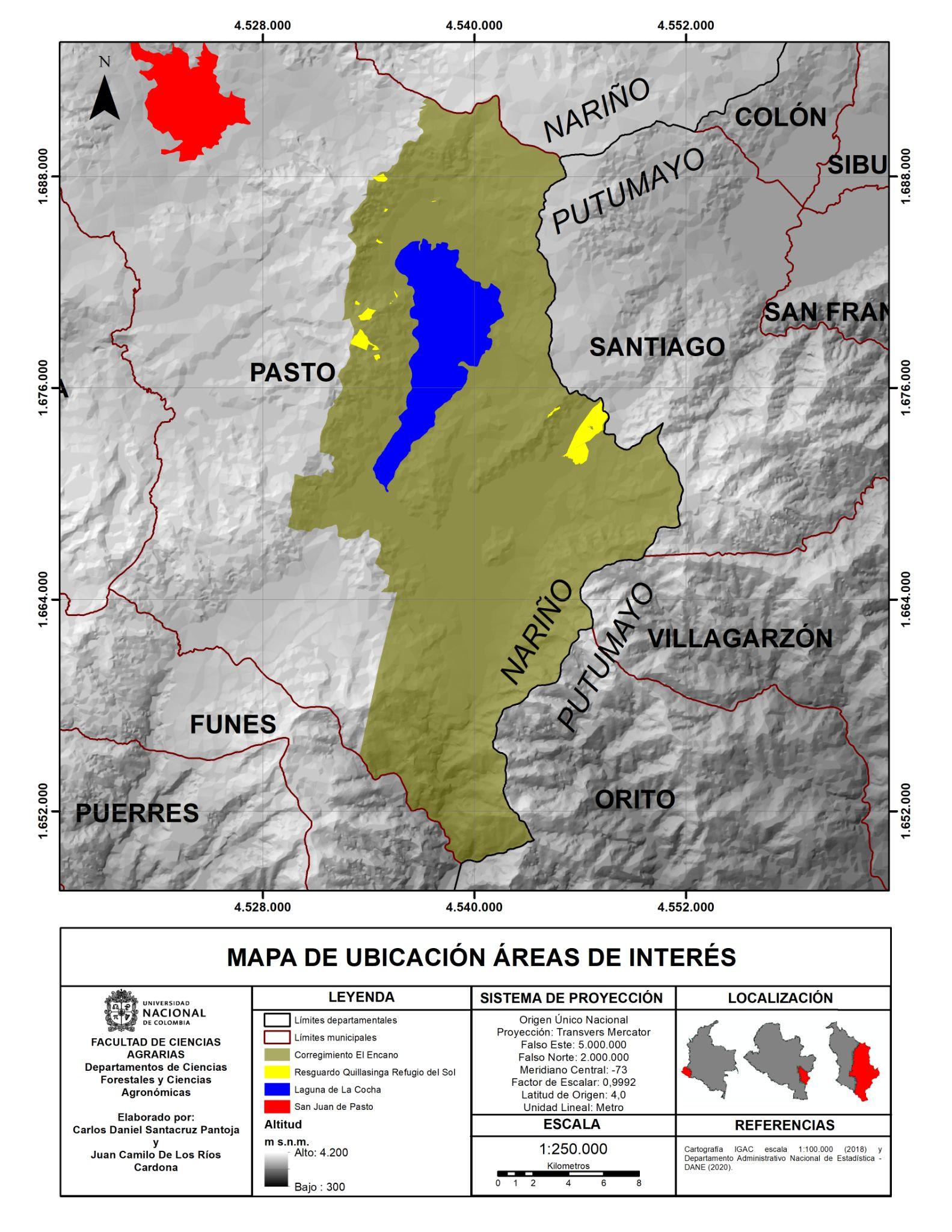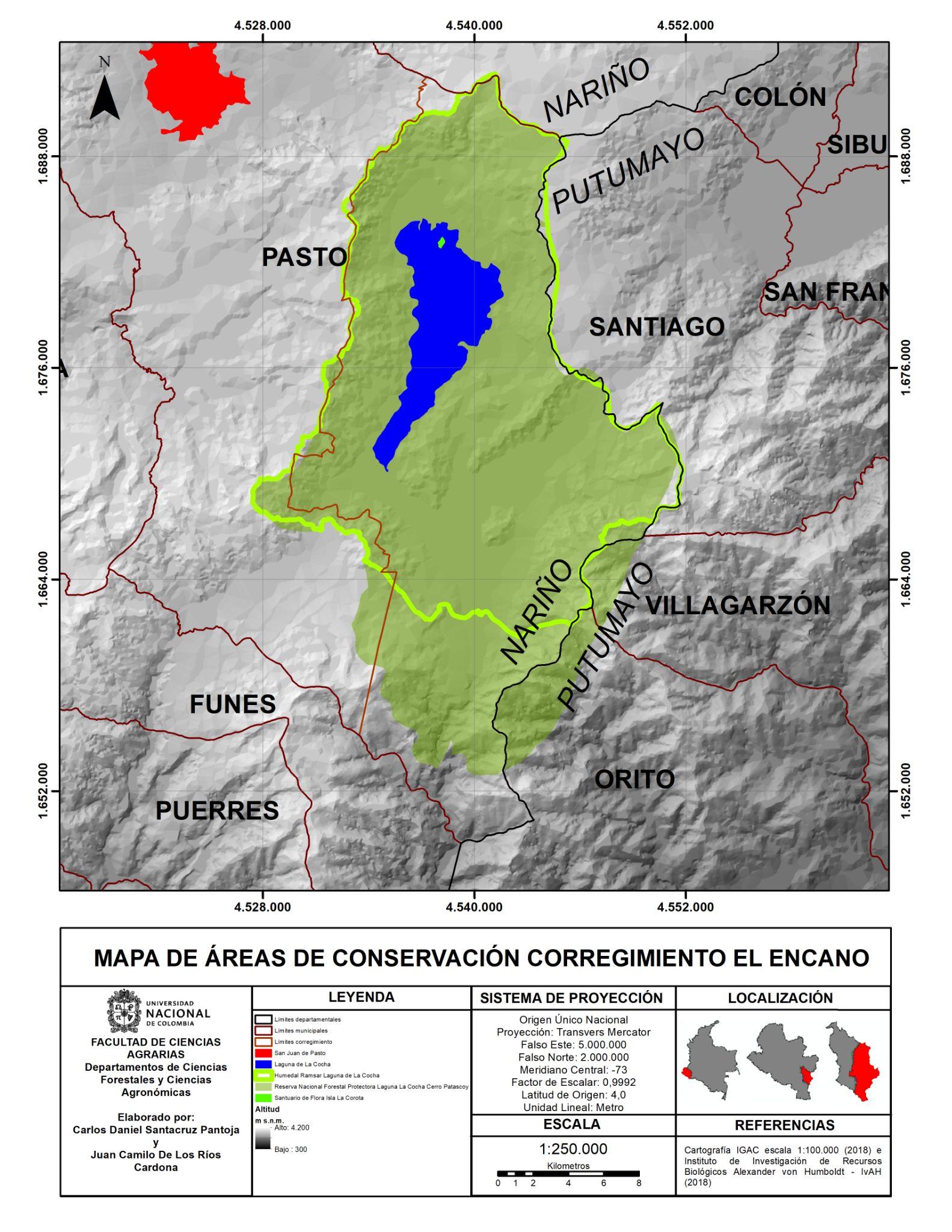 La laguna de La Cocha se ubica al suroccidente de Colombia, en el corregimiento El Encano, uno de los 17 corregimientos del municipio de Pasto, departamento de Nariño. Este corregimiento se tomó como área de estudio por la practicidad en los límites y porque la comunidad indígena local lo ve como su territorio ancestral. El área tiene 48,270 ha, hace parte de la Ecorregión Corredor Andino Amazónico Bordoncillo Patascoy – La Cocha, así como del Piedemonte Amazónico Colombiano (CORPONARIÑO, 2008) (ver Figura 1). Por su importancia biológica, ecológica y cultural, el corregimiento El Encano es el epicentro de tres áreas de conservación muy importantes: la Reserva Forestal Protectora Nacional (RFP) Laguna La Cocha-Cerro Patascoy, el Parque Nacional Natural Santuario de Flora (PNNSF) Isla de La Corota y el Humedal Ramsar Laguna de La Cocha (ver Figura 2).
