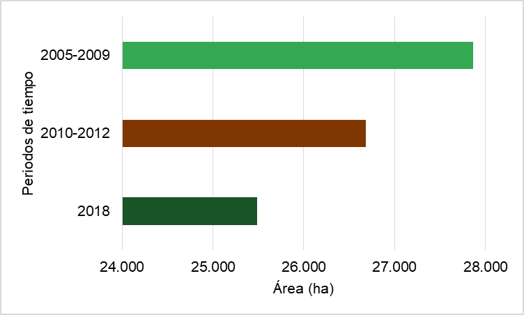 Como punto de partida se analizó el nivel de protección que han brindado estas figuras de conservación, midiendo la deforestación y el crecimiento de la frontera agrícola, a través de la revisión de los mapas de coberturas realizados por el Instituto de Hidrología, Meteorología y Estudios Ambientales (IDEAM), quienes usaron la metodología Corine Land Cover (CLC) adaptada para Colombia. Se escogieron tres mapas a una escala de 1:100.000 de tres periodos distintos: 2005-2009; 2010-2012 y 2018, realizados a partir de imágenes satelitales Landsat 5 y 7. Con soporte de ArcMap 10.7.1, se realizó la medición y comparación de las coberturas de nivel 3 a través de los tres periodos de tiempo.