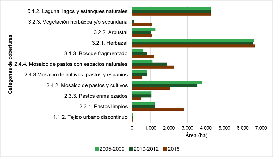 Los resultados demuestran una acelerada transformación en el territorio, destacando la pérdida de bosques en periodos tan cortos. Solo de 2005-2009 a 2018 se registraron 2,377 ha deforestadas de bosque denso (ver Figura 4). A su vez, se amplió la cobertura de bosque fragmentado en 593 ha, acompañado de pastos limpios que aumentaron 1,617 ha. Por su parte, es claro el crecimiento urbanístico que pasó de 7.49 a 12.4 ha, pero cabe resaltar que la unidad mínima cartografiable (25 ha) de la metodología empleada por el IDEAM no permite analizar el crecimiento urbanístico alrededor de la laguna —casas con cierta separación y baja densidad— que ha aumentado por el turismo de la zona. A modo visual y cuantitativo llama la atención la disminución de los mosaicos de pastos y cultivos, y de cultivos, pastos y espacios naturales que, como se puede ver en la Figura 3, se han visto reemplazados por mosaicos de pastos con espacios naturales y, sobre todo, por pastos limpios. En la Figura 6 se puede visualizar fotografías de algunas coberturas en el área de estudio.