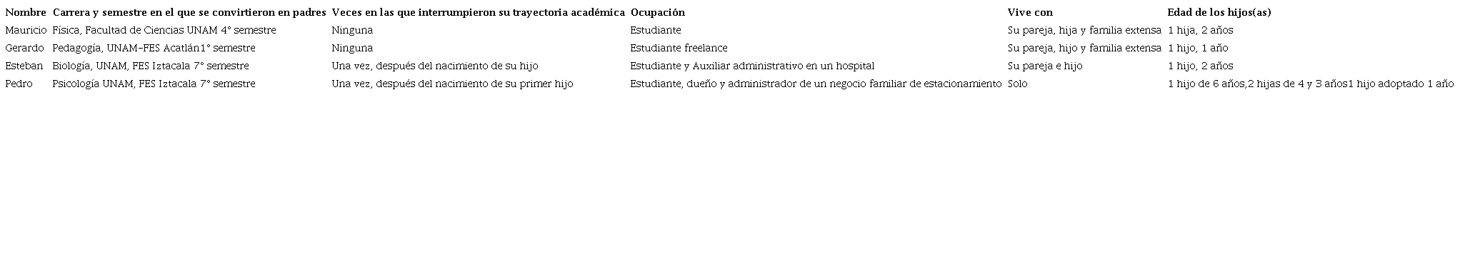 Se contactó por medio de una convocatoria y la técnica bola de nieve, a cuatro hombres jóvenes que fueran padres mientras estudiaban en uno de los campus de la Universidad Nacional Autónoma de México (UNAM) durante el 2019-2020, concretando una cita-para realizar el proceso de negociación y realizar el consentimiento informado-, en puntos medios o espacios cercanos a sus centros académicos. Se negoció éticamente la realización de tres entrevistas semiestructuradas de aproximadamente una hora o dos horas máximo, dependiendo del tiempo disponible de cada entrevistado. Las entrevistas fueron transcritas en su totalidad con fines de análisis. De acuerdo con los criterios de respeto, confidencialidad y beneficencia en la investigación, se cambiaron los nombres de los entrevistados a Mauricio (22 años), Gerardo (23 años), Esteban (26 años) y Pedro (29 años), todos ellos padres jóvenes que cursan sus estudios mientras son padres de hijos menores de 10 años. A continuación, se incluye una tabla con sus datos: