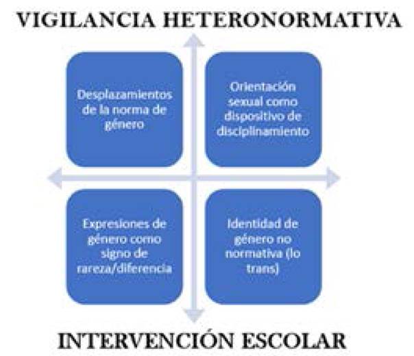 Identidad de género no normativa (lo queer/trans). Visto como herramienta que permita buscar las contradicciones o las incomodidades de las expresiones de género en la escuela que aparezcan como resultado de las manifestaciones afectivas y conductuales Para la comprensión de las nuevas historias o expresiones de lo masculino en la secundaria, se ubicaron dos ejes transversales que tienen presencia en la forma de clasificar e intervenir en los momentos de crisis. El primer eje es la vigilancia heteronormativa, entendida como la disposición y las formas de supervisión escolar en la producción y legitimidad de los cuerpos masculinos. Desde esta vigilancia, se trata de reconocer los niveles de autoridad en el ejercicio de poder desde la aplicación de la normativa escolar (leyes, programas, protocolos institucionales) hasta las disposiciones locales (reglamento escolar).