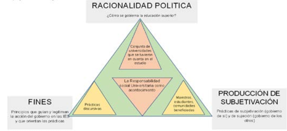 Con el enfoque metodológico centrado en estudios de la gubernamentalidad permite exponer unos resultados que tensionan la categoría conceptual de la responsabilidad con aspectos relacionados con el origen de la universidad y sus hitos que permiten comprender los acontecimientos, tanto en el nivel discursivo como disciplinar de lo que significa la RSU en el actual modelo de gestión y relacionamiento con la sociedad.