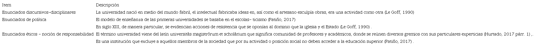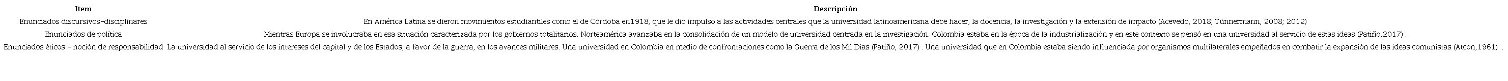 Se presentan los hallazgos relacionados con los componentes del diseño metodológico desde una perspectiva histórica, reflexiva y crítica, donde se analizan las trayectorias de la responsabilidad de la universidad. Se toman elementos de la arqueología con el fin de analizar las prácticas discursivas que se dan alrededor de la responsabilidad de la universidad, tales como el archivo, el enunciado y las formaciones discursivas, a nivel genealógico, se analizan las prácticas no discursivas asociadas con el poder. En este sentido, implica analizar desde la historia misma de la universidad ¿cuál es la responsabilidad que la ha caracterizado?, y ahí evidenciar elementos de la racionalidad política, fines y procesos de subjetivación que gobierna los discursos de la responsabilidad de la universidad.
