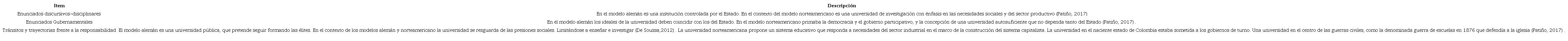 En la misma línea y como parte del análisis se exponen los diversos modelos de universidad que han influido en la configuración de las universidades colombianas, de manera que se identifique en ellos los antedichos enunciados discursivos- disciplinares y gubernamentales, con el propósito de introducir en las conclusiones un dialogo con los conceptos de responsabilidad, RSU y responsabilidad política.
