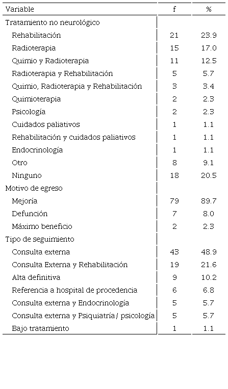 Posterior a la cirugía neurológica el tratamiento indicado fue la rehabilitación (23.9%), la radioterapia (17%), y la radioterapia con quimioterapia (12.5%). El motivo del egreso en la mayoría de los casos fue la mejoría (89.7%), con seguimiento en la consulta externa (48.9%), (Tabla 4).