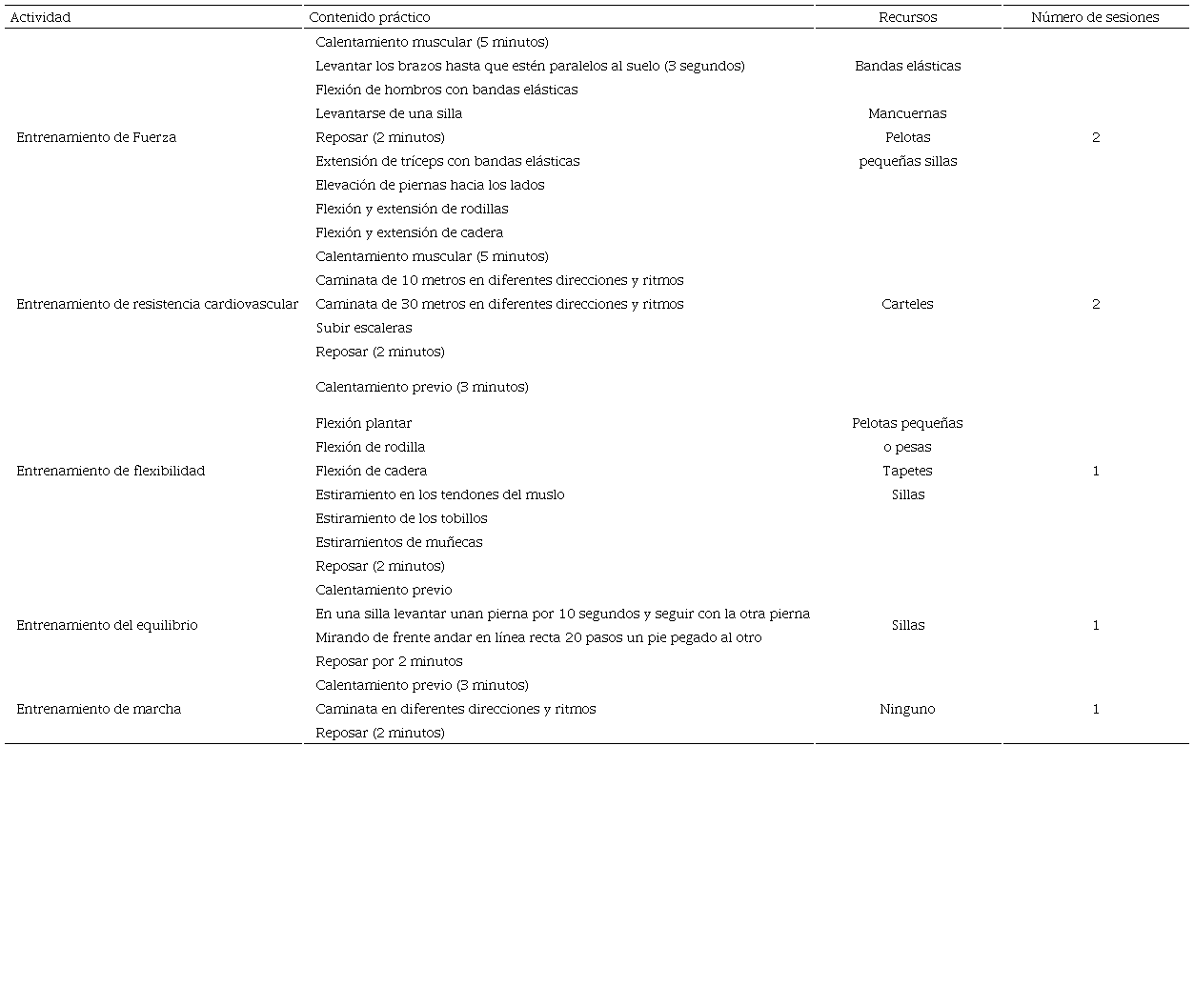 Se implementó una intervención de enfermería basada en un programa de ejercicio físico de manera semanal. El diseño de la intervención se basó en el análisis de diferentes artículos donde se realizaron ejercicios físicos en AM para tratar la fragilidad 13-15. Dicho programa consistió en 7 sesiones distribuidas a lo largo de 4 semanas; cada una de las sesiones consistió en 50 minutos de ejercicios enfocados en el entrenamiento de la fuerza, el entrenamiento de la resistencia cardiovascular, la flexibilidad, el equilibrio y la marcha. En la tabla 1 se observan los ejercicios realizados para cada uno de los entrenamientos. Posterior al entrenamiento, se aplicó nuevamente el cuestionario FRAIL a los participantes que concluyeron el programa de ejercicio físico.
