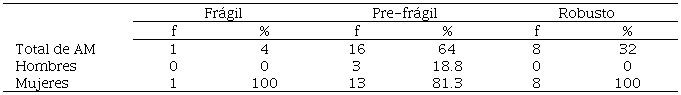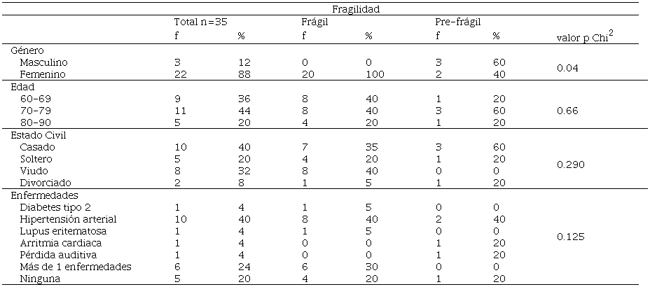 En el estudio predominó el género femenino con 88 %. La variable edad se encontró en el rango de 60 a 90 años, con media 73.4 ± 7.3, donde predominaron los AM de 70 a 79 años. Con respeto a la variable estado civil, los adultos casados representaron el 40 %. El 20 % de AM reportaron no padecer ninguna enfermedad, mientras que otro 40 % reportó padecer hipertensión arterial sistémica que fue la enfermedad que más prevaleció, además, el 24 % refirió tener más de 1 enfermedad. Se encontraron diferencias estadísticas significativas (p<0.05) entre fragilidad y género, sin embargo hay que considerar que el número de AM hombres fue inferior al número de AM mujeres. Por otra parte, no se encontraron diferencias estadística significativas entre fragilidad y edad, estado civil y enfermedades (p>0.05), (Tabla 2).