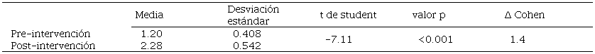 Para el análisis de datos se empleó el paquete del programa Statistical Package for the Social Sciences (SPSS) versión 25. Se realizó análisis estadístico descriptivo, frecuencia y porcentaje para las variables categóricas, así como media y desviación estándar para variables numéricas. Para el análisis estadístico inferencial, se emplearon las pruebas estadísticas, McNemar para comparar variables categóricas dicotómicas y Chi2 para variables nominales; t de student para muestras relacionadas para comparar las medias antes y después de la intervención, así como la d de Cohen para calcular el tamaño del efecto.