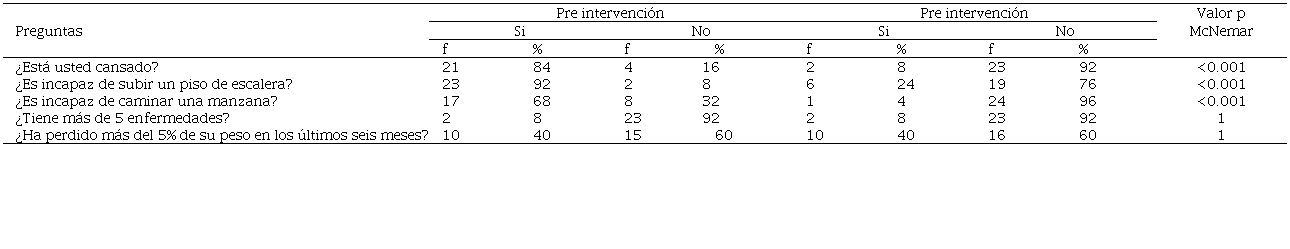 Resultados: El 88 % fueron mujeres y 12 % hombres. La prevalencia de fragilidad fue 80 % en adultos mayores antes de la intervención. Los criterios de fragilidad más frecuentes fueron: cansancio, incapacidad para subir escaleras y dificultad para caminar. Después de la intervención la prevalencia fue de 4 % para pacientes frágiles y 64 % para prefrágiles. Todos los participantes tuvieron alteraciones en la marcha; sólo 12 % presentaron reducción en su masa muscular. El efecto de la intervención resultó ser grande y estadísticamente significativo.