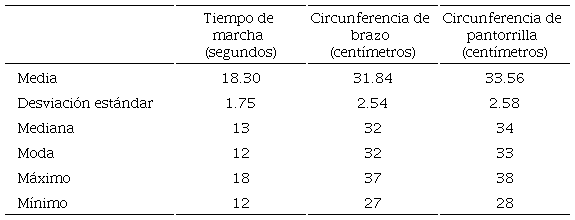 De manera adicional, se realizaron mediciones de la circunferencia de brazo y pantorrilla como determinante para la disminución de masa muscular. Además, se utilizó la prueba timed get Up and Go para cuantificar en segundos el tiempo de marcha, con ayuda de un cronómetro. Este test categoriza clasifica a los participantes en frágiles y con riego de caídas con un tiempo entre 10 y 20 segundos, sin limitación funcional y bajo riego de caída menos de 10 segundos; y con limitación funcional y un elevado riego de caída con más de 20 segundos. La prueba ha sido validada con una sensibilidad del 87 % y una especificidad del 87 % 18.