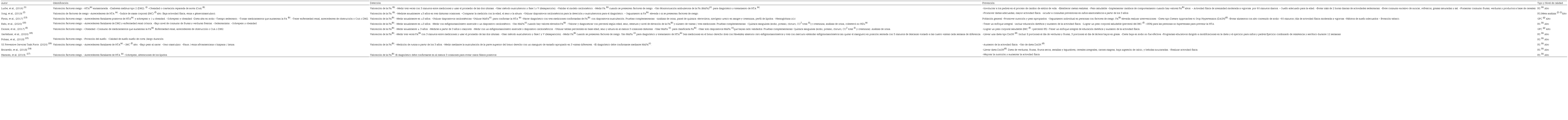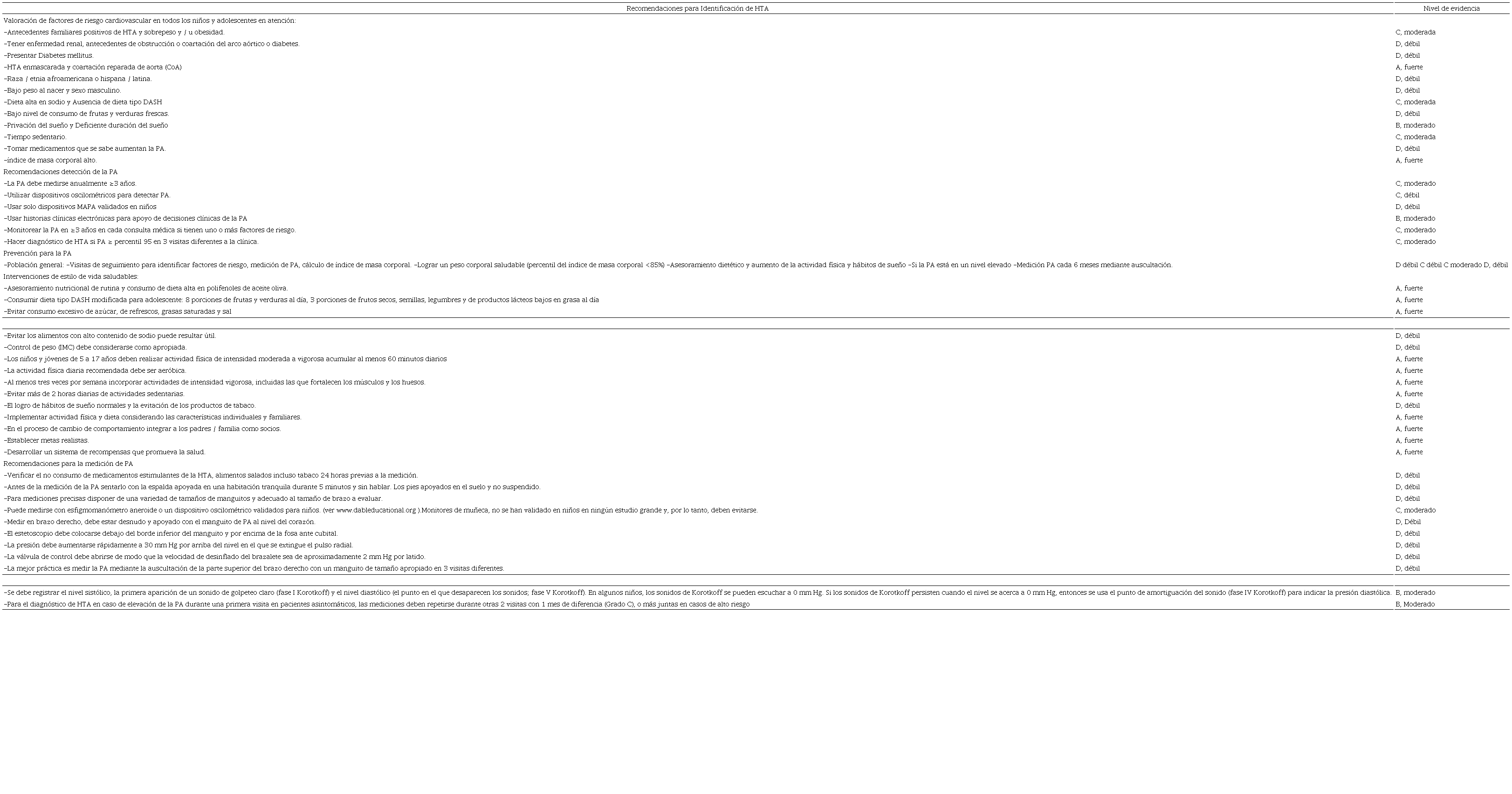En la tabla 2, se observa que las recomendaciones clínicas tanto de las GPC y RS con relación a la identificación de niños y adolescentes fue considerar la valoración de los factores de riesgo cardiovasculares (1,2,8,13,15,17-19. Cabe destacar que los factores de riesgo más importantes según el nivel de evidencia fue presentar sobrepeso y obesidad (A fuerte), malos hábitos de sueño (B moderada). Para las recomendaciones de detección los estudios 1,2,8,13,16,17-19 se enfocaron a la medición de la PA a partir de los 3 años con dispositivos oscilométricos adecuados para la edad, sexo y complexión de los niños y adolescentes según las recomendaciones de AAP 20, así como la valoración de la Monitorización ambulatoria de la PA (MAPA) Evidencia (C moderada) 21.