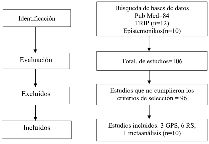 Methodology: Systematic scoping reviews of clinical practice guidelines, systematic reviews and meta-analyses of studies not older than 5 years were used, in Spanish and English, with searches in PubMed, TRIP, and Epistemonikos databases. A total of 106 studies were found using the Boolean operators AND, OR, and NOT; of these, only 10 complied with the methodological quality of the Critical Appraisal Skills Programme and Clinical Practice Guideline Evaluation instruments. A qualitative analysis of the main recommendations according to the level of evidence was used.