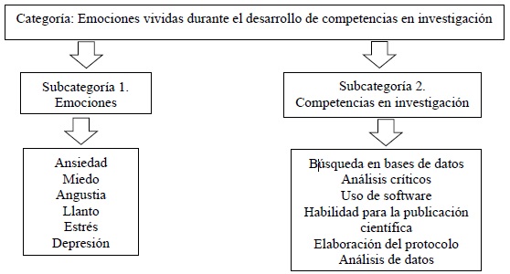 La categoría surgida de la investigación fue: Emociones vividas durante el desarrollo de competencias en investigación, cuya desagregación permitió el establecimiento de dos subcategorías complementarias: emociones y competencias en investigación.