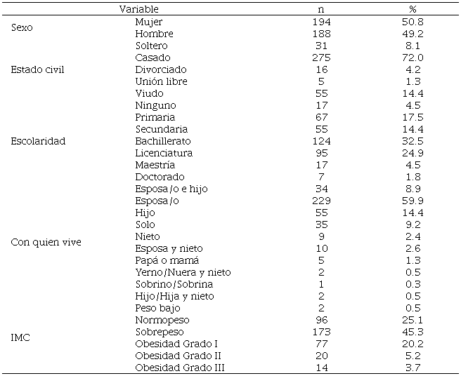 Metodología: Estudio descriptivo, transversal, muestra de 382 personas adultas mayores de 60 años y más de ambos sexos derechohabientes de dos clínicas de primer nivel de atención médica del Instituto de Seguridad y Servicios Sociales de los Trabajadores del Estado, que acudieron a consulta médica. Se excluyó a quienes por cuestiones de salud fueron derivadas al servicio de urgencias. Se empleó cédula de datos sociodemográficos y cuestionario de Control del Riesgo de Obesidad, emanado de la taxonomía de resultados de enfermería. Se contó con la aprobación del Comité de Ética en Investigación de la institución de salud. Los datos se analizaron a través de medidas de tendencia central y distribución de frecuencias.