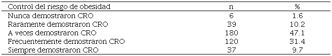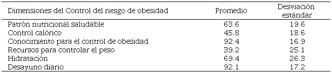 Resultados: El 45.3 % presentaron sobrepeso y el 29.1 % obesidad. El control del riesgo de obesidad con promedio bajo fue recursos para controlar el peso. El 47.1 % refirió que a veces llevan control del riesgo de obesidad.