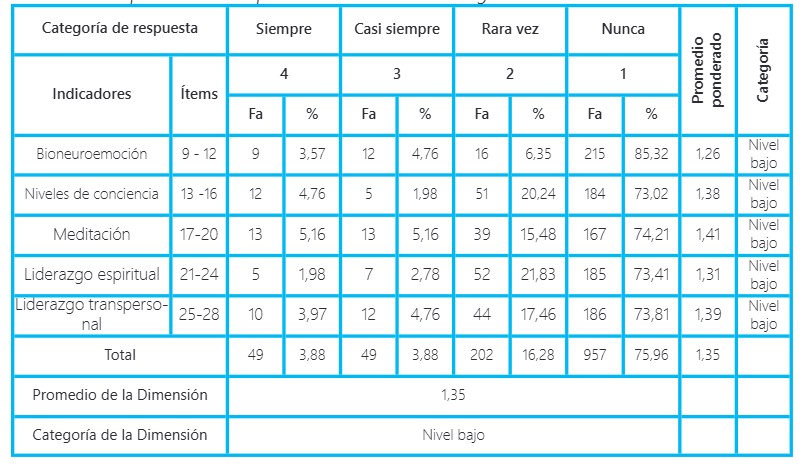 Los resultados destacan la falta de integración de competencias transpersonales como Bioneu- roemoción, niveles de conciencia y meditación en la organización, mostrando un espacio sig- nificativo para el mejoramiento. En cuanto al "liderazgo espiritual", un predominante 73,41% indicó "nunca" practicarlo, seguido de un 21,82% que dijo "rara vez", con apenas un 2.78% y un 1,98% eligiendo "casi siempre" y "siempre" respectivamente, resultando en un promedio de 1,41, lo que señala una aplicación mínima. Similarmente, el "liderazgo transpersonal" reflejó un bajo nivel de aplicación con un 73,81% eligiendo "nunca", sugiriendo una necesidad urgente de fortalecer estas áreas clave dentro de la organización.