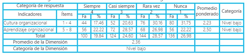 una limitación en su efectividad. Estos resultados subrayan la necesidad crítica de abordar y mejorar estas áreas para promover un ambiente más sólido de aprendizaje organizacional.