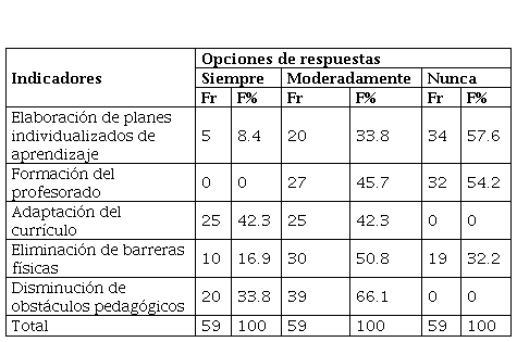 En cuanto a la eliminación de barreras físicas, el 50.8% de los encuestados cree que esta eliminación se realiza de manera moderada, el 32.2% indica que nunca se lleva a cabo, y el 16.9% restante piensa que siempre se elimina estas barreras. Finalmente, en relación con la disminución de obstáculos pedagógicos, el 66.1% de los docentes considera que esta disminución se realiza de manera moderada, el 33.8% indica que siempre se lleva a cabo, y ningún docente piensa que nunca se realiza.