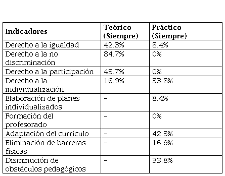 En la tabla 1, se muestran los componentes teóricos de la inclusión educativa, respecto al indizados; Derecho a la igualdad, el 57.6 % destacaron que siempre en las instituciones educativas se reconoce este derecho desde los lineamientos institucionales y el 42.3% de los docentes reconocen que moderadamente la inclusión se ha abordado como un derecho de todos los niños.