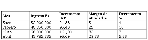 Por consiguiente, el incremento fue determinado mediante el valor fijo del mes de diciembre del año 2017, el cual fue de 25.000.000 Bs con respecto a los meses de enero, febrero y marzo, mientras que el decremento se determinó con un margen de utilidad del mes de diciembre del año 2017 de 35%. Concluyendo que a pesar de que la empresa incrementa sus ingresos mensualmente y en promedio en un 93,09%, obtiene un decremento promedio de 5,66%, con ventas mensuales promedio de 48.783.333 Bs.