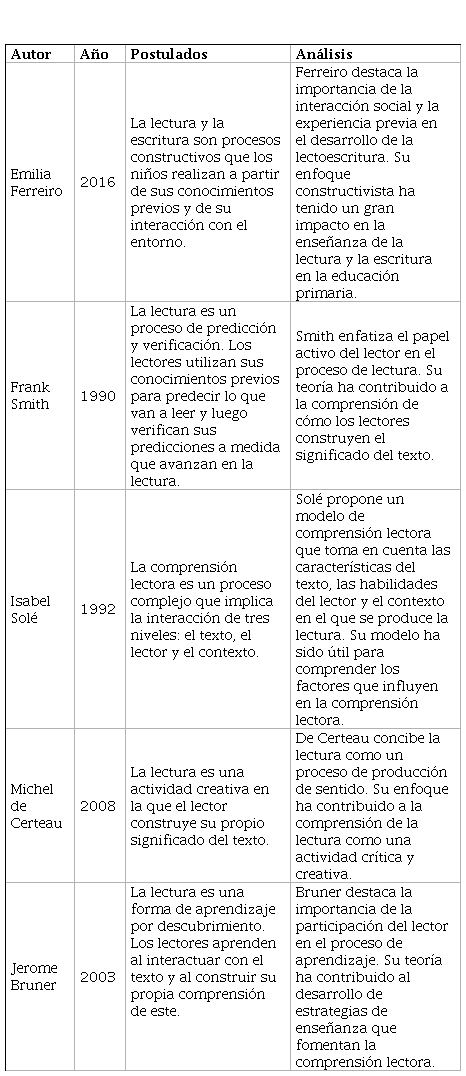 Al analizar las teorías clásicas propuestas sobre la lectura se concluyó que, las teorías clásicas propuestas por destacados investigadores como Emilia Ferreiro, Frank Smith, Isabel Solé, Michel de Certeau y Jerome Bruner proporciona una comprensión profunda de los fundamentos teóricos que sustentan el proceso de lectura. Estos autores ofrecen una variedad de perspectivas que abordan aspectos importantes del desarrollo lector, como la adquisición del lenguaje, la comprensión de textos y la formación de significados. Sus contribuciones teóricas son fundamentales para comprender cómo los estudiantes construyen el significado a partir de los textos que leen y cómo los educadores pueden diseñar estrategias efectivas para fomentar la comprensión lectora en el aula.