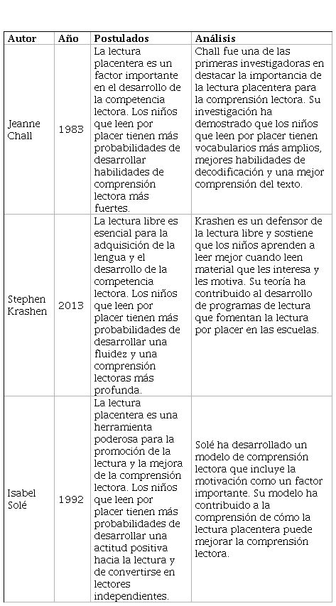 En relación con los vínculos entre la lectura placentera y la comprensión lectora en estudiantes de primaria, los resultados revelan una conexión directa entre la lectura placentera, especialmente a través de textos narrativos, y la mejora de la comprensión lectora en estudiantes de primaria. En este sentido, autores como Jeanne Chall, Stephen Krashen, Isabel Solé y Richard Allington han destacado cómo la lectura por placer no solo aumenta la motivación y el interés por leer, sino que también fortalece las habilidades de comprensión, vocabulario y fluidez lectora. Estos hallazgos subrayan la importancia de promover experiencias de lectura positiva y atractiva en el entorno escolar para cultivar lectores competentes y apasionados.