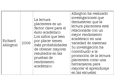 Mientras que, Allington (2006) destacó la relación entre la cantidad de lectura y la comprensión lectora, argumentando que los estudiantes que leen más tienden a comprender mejor lo que leen. Por ello, la lectura placentera promueve una actitud positiva hacia la lectura y la disposición a leer de forma regular fuera del horario escolar, lo que aumenta la exposición a diferentes tipos de texto y fortalece las habilidades de comprensión a lo largo del tiempo.