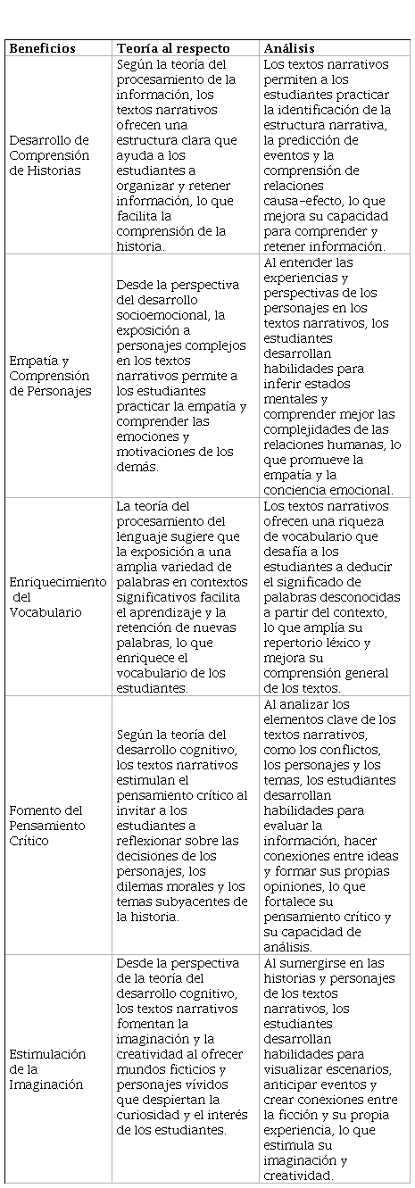 La Tabla 3 presentado ofrece una comprensión holística y detallada sobre cómo los textos narrativos impactan positivamente la comprensión lectora en estudiantes de primaria. Al respaldar cada beneficio con teorías pertinentes del ámbito educativo y psicológico, proporciona una base sólida para entender los mecanismos subyacentes detrás de estos beneficios.