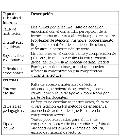 En cuanto a la identificación y comprensión de las dificultades de los estudiantes para leer, tanto internas como externas, los resultados reflejan que son significativas para diseñar intervenciones efectivas que aborden estas barreras. Factores como la falta de motivación, las dificultades cognitivas, el bajo nivel de vocabulario, los desafíos emocionales, el entorno escolar y las estrategias pedagógicas inadecuadas pueden afectar negativamente la comprensión lectora. Al reconocer estas dificultades y sus causas subyacentes, los educadores pueden implementar enfoques diferenciados y personalizados que ayuden a los estudiantes a superar estos obstáculos y mejorar su competencia lectora.